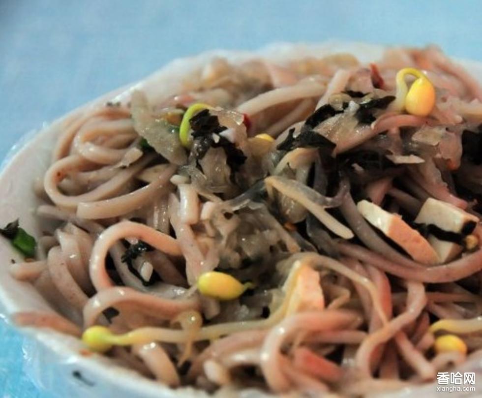 長治黑圪條是山西長治著名的漢族小吃。是用紅面包住白面或白面包住紅面,或混合攪拌和成的面團(tuán)用手工搟制成大片,再切成8寸長,韭葉寬,或裙帶寬的條,下鍋煮熟的一種面食,是長治地區(qū)流傳的一種黑色面條。因煮熟的面條黑紅色,故得名“黑圪條”。黑圪條主要原料是高粱面,做時再摻些白面和豆面更好。