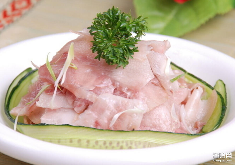 4. 撇去浮油,撈出豬頭,放入冷水中浸透,去掉骨頭,再把凈肉泡入大缸內(nèi)用冷水浸泡,成白色即成;