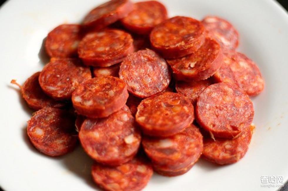 原料配方:新鮮豬肉(精肉占50%以上)100千克精鹽3.5千克亞硝50克白糖5千克紹興酒10千克香油4千克五香面(用白籽、豆蔻、陳皮、肉桂、山柰、丁香、砂仁、花椒、大料等配制而成)500克 制作方法: 1.把精肉和肥肉按比例切成小塊,用絞肉機(jī)絞成肉末,加入調(diào)料,用力攪拌均勻,制成肉餡,并稍加腌制。 2.腌制好后,用漏斗把肉餡灌入整理好的腸衣中,用針扎一些孔,排除腸中的空氣,用麻繩打結(jié)扎成小段,放在陽(yáng)光下曝曬至半干,懸掛在竹竿上,置于通風(fēng)處晾掛,20天左右,取下進(jìn)行蒸制。 3.將曬干的小香腸放入蒸鍋內(nèi)蒸制,大約30分鐘后,取出冷卻即為成品。 4.貯存小香腸時(shí)要采用懸掛的形式進(jìn)行,場(chǎng)地要干燥,溫度較低,防止日曬,可貯存1年多,其質(zhì)不變。