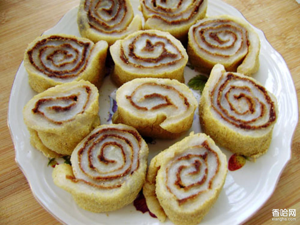 3.在江米面上下兩面都粘上黃豆面,搟薄,卷成卷后切成小塊裝盤。也可撒上白糖吃。