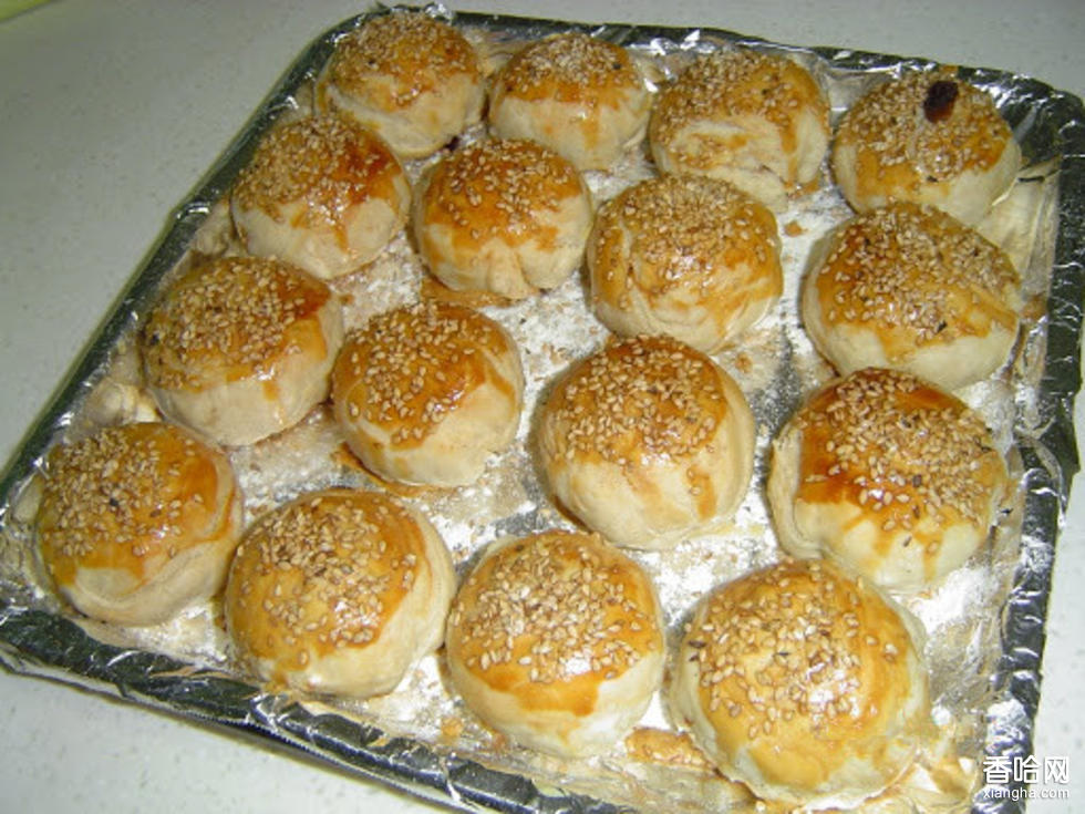 把肉剁成末,和蔥、面醬、香油等調(diào)勻成餡。制瓤。成形:將剩余的面粉加水和勻成水面團,再搟成圓片,把面瓤放在水面片上,前后對折,用面杖把兩側(cè)搟平封口,再搟成長方形,切去左右毛邊,橫切為兩塊,分別卷成面卷,再揪成小劑。取一劑用拇指在面卷接茬處按窩。放入肉餡,縮口,用左手食指拇指提住餅坯輕輕轉(zhuǎn)動呈棋子形后,將光面撒勻麻仁,放在烤盤內(nèi)。烘烤。特點:杏黃色,形如棋子,外酥里嫩。