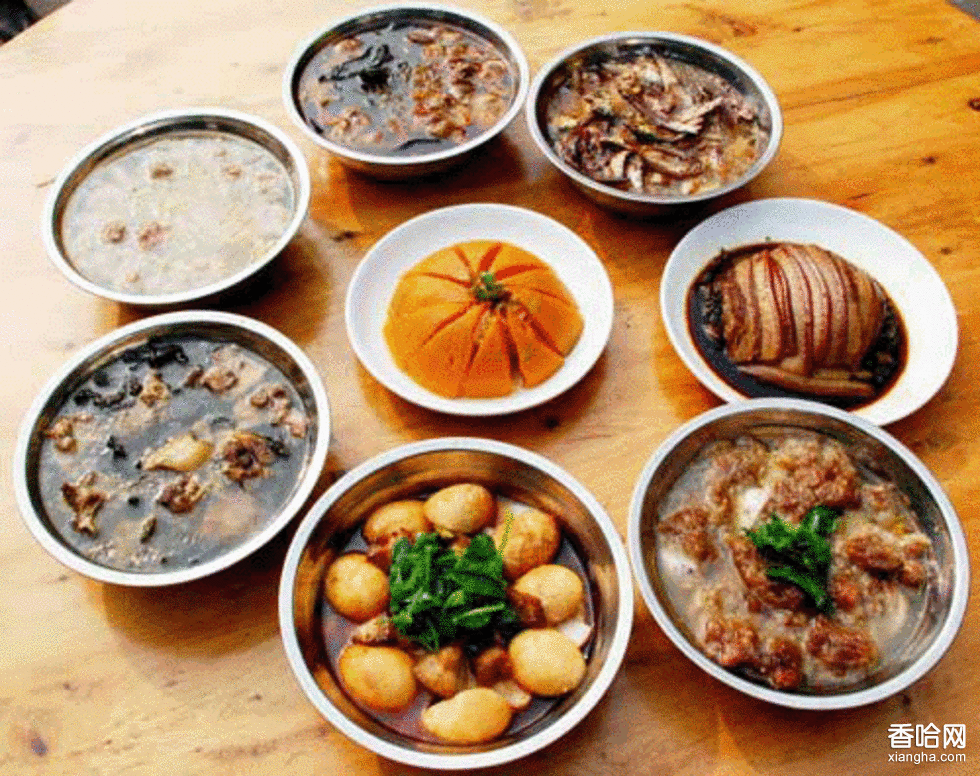 說起這有名的八大碗,還有一個有趣的傳說呢:相傳八仙過海時無意惹怒龍王,東海龍王便與之交戰(zhàn)起來。因兩邊實力相當而久戰(zhàn)難勝,勞累疲憊,退踞海灘稍憩,頗覺腹中空空,饑餓難忍,便分頭尋食充饑,哪知一眼望去的海灘薄地,荒無人煙。除曹國舅一人未回,其余個個掃興。原來曹國舅一人不辭勞苦,遠行至內(nèi)地,忽聞一股奇香撲鼻,不覺垂涎三尺,立即尋香進入凡間一莊上,喬裝農(nóng)家村夫在莊主宅院窺視,只見四方桌上八人圍座、誘人的菜肴一個接一個地上。國舅尋思道:我原乃朝廷國舅,宮廷菜肴我享用得發(fā)膩,農(nóng)家菜肴我未曾見過,何不先讓我大飽口福,忽想眾仙友腹空我豈可獨享,繼而采帶了七樣菜肴,又想起仙姑不食葷,所以又為其獨帶了—素菜,計八大碗并留言:國舅為眾仙借菜八碗,日后定當圖報。