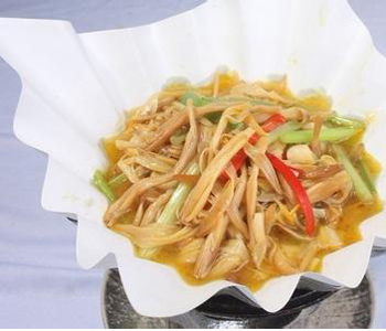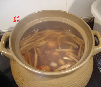 2、砂鍋中放入清湯1000毫升,置火上煮沸,撒少許鹽,放入豬肉絲,沸滾后,撇去浮沫,入香菇絲再煮3分鐘加入黃花菜,淋上香油即成。
