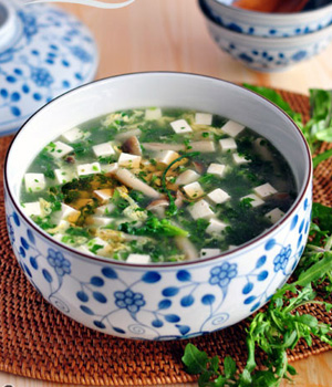 2、鍋中加水,放入植物油,接著放入菱角菜,再煮沸,倒入雞蛋稍煮片刻,加入精鹽,味精,盛入大湯碗內(nèi)即成。