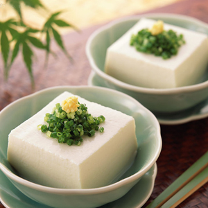 2、豆腐切成1.5厘米長、1.2厘米寬、1厘米厚的塊,入沸水鍋內(nèi)悼水后撈出;姜切片;蔥切花。