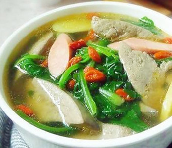 秋冬季節(jié),天氣很明顯變得干燥,這時候最適合用豬肝和菠菜滾湯,湯清澈鮮甜之余,還有以形補形之效。豬肝和菠菜富含維生素A、B2、鐵和鉀,兩者一葷一素煮湯飲用,除了有補肝、明目和補血的作用,還是治療貧血、口角炎和夜盲癥的佳品。下面我們就來了解豬肝菠菜湯的功效。
