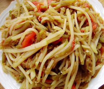 6.將土豆絲炒至斷生后,放入茄子絲。