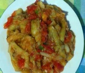 放入茄子丁土豆丁一起炒,待茄子稍蔫加入水。