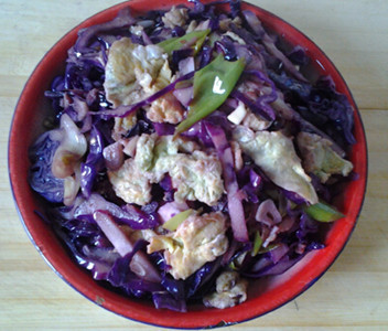 4、加入炒熟的雞蛋混合紫甘藍菜絲,炒散后加少量鹽即可盛盤食用。