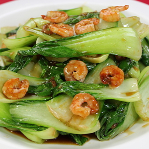 3、熱鍋放油,爆香蔥姜末。倒入蝦仁,油菜翻炒,加入精鹽,醬油,五香粉。