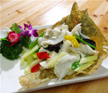 多肉少刺的多寶魚,由于營養(yǎng)豐富,肉質(zhì)鮮嫩、口感清香,一直深受大家的寵愛。多寶魚的食用方法多為清蒸、清燉,或用來做生魚片。大廚將多寶魚的魚肉起片,卻不是制作生魚片。而是將魚骨油炸做盛器,魚肉拉油保鮮,搭配蘆筍翻炒入味,清香誘人。由于魚肉在拉油之前用蛋白、鹽等腌制,又有姜蒜蔥的調(diào)味,肉質(zhì)結(jié)實(shí)而鮮嫩,不帶一絲腥味。對于不喜歡魚腥味而又想吃魚的人士來說,這道菜是一個(gè)很不錯(cuò)的選擇。