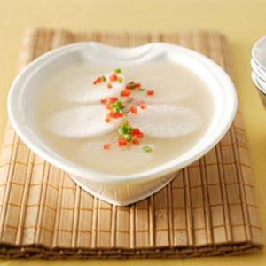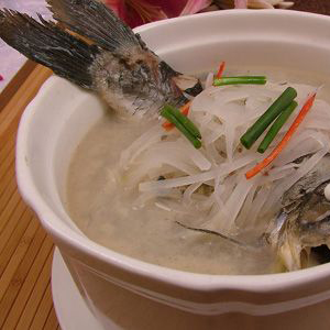 2、炒鍋炒熱放入豬油燒至五成熱時,投入姜,放入魚煎至兩面略黃,加入750克開水、料酒,蘿卜絲用開水焯一下?lián)瞥龇湃脲佒?,加入蔥結(jié)用旺火燒7分鐘左右,待湯汁燒至乳白色,放入精鹽、味精,揀去蔥結(jié)、姜,撒上胡椒粉,然后先用勺子將鯽魚舀入湯碗中,再將湯和蘿卜絲倒入碗中即成。