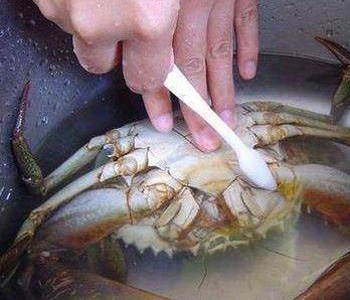 第二步:讓梭子蟹在水中浸泡5—10分鐘,充分沐浴一番。通過酒的刺激,將體內的贓物排出,同時也可以通過白酒將蟹醉暈。
