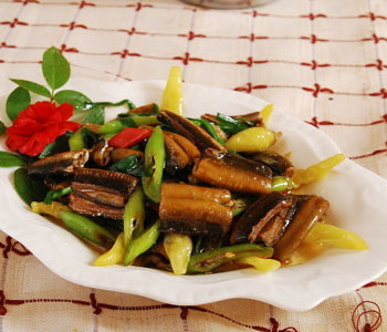 第四、看鱔絲皮色?;铧S鱔加工的鱔絲,表皮黑中透亮,皮色光潔,死黃鱔則帶灰,略暗。