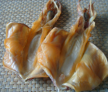 墨魚干又稱螟晡鲞,是淡干海昧品。加工墨魚干時,如果用海水洗刷,干品格外潔凈,呈透明狀,肉質中顯露出晶亮的杏黃色,之后表面又泛出一層甘露醇,更加美觀。在加工過程中一旦遇上陰雨天,用海水刷的墨魚片,比用淡水刷的墨魚片,能延長l2小時以上不變質。這是因為海水中含有氯化鈉,它對墨魚有脫水和固定蛋白質的作用,可使墨魚表面肌肉收縮結實,避免水分和墨汁等污物的滲入。