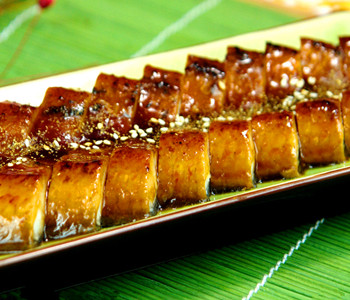 材料:鰻魚1條,醬油40ml,白糖20g,甜味紅酒2茶匙,油2茶匙,熟芝麻適量。