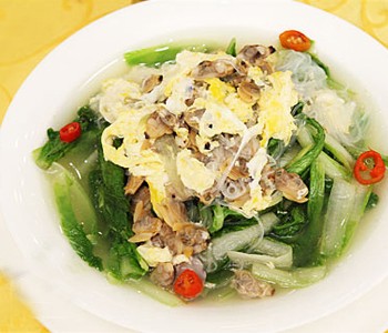 (5)起鍋下花生油,放入蔥花下蒸好的黃豆汁、渣、雞蛋略煎、在加入蛤蜊肉、蘿卜絲、蛤蜊湯、鹽、味精、燜制10分鐘待蘿卜絲軟爛即可上桌;