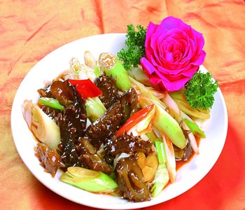 3、加少許面醬翻炒,然后下入蔥絲,最后加入調(diào)好的水淀粉,加少許鹽和味精適量,大火收汁,出鍋即可。