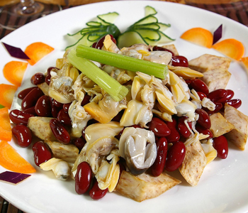 花甲肉+百合+玉竹+淮山藥:同煮湯食用,可治口干、干咳、心煩、手足心熱等癥。