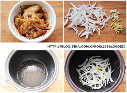4、在電飯煲或電飯鍋內(nèi)膽里倒入1小勺香油,放入洋蔥絲和姜絲,放上腌制好的雞翅和蒜片,通電