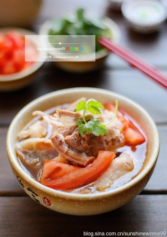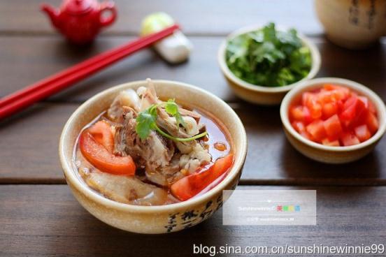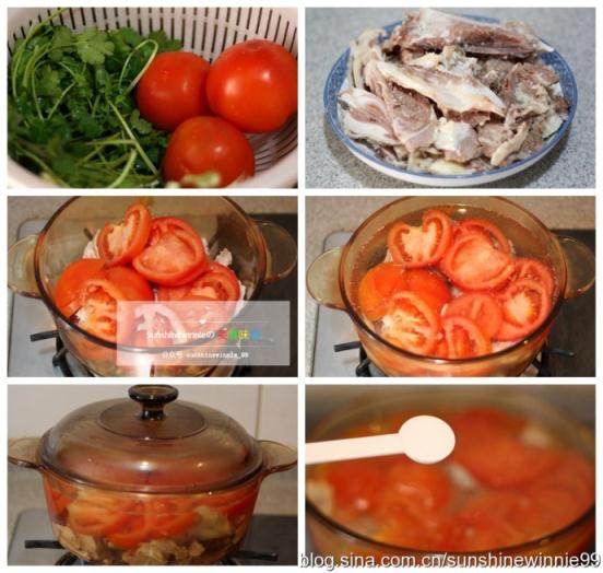 原料:羊肉500克 礦泉水1100ML 番茄2個(gè)400克左右 鹽10克 香菜