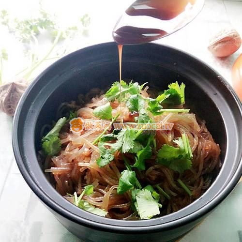 11.砂鍋提前加熱備用,煮好的粉絲馬上倒進(jìn)砂鍋中,撒上香菜,淋上適量麻油,美味勢(shì)不可擋。