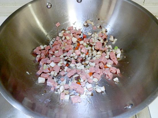 香菇去蒂切丁、火腿切丁、蔥蒜切片、紅辣椒切片。