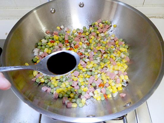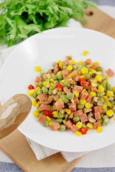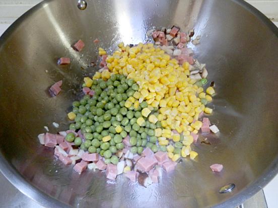 原材料:青豆200g、玉米粒200g、香菇、紅辣椒、火腿、蔥蒜。