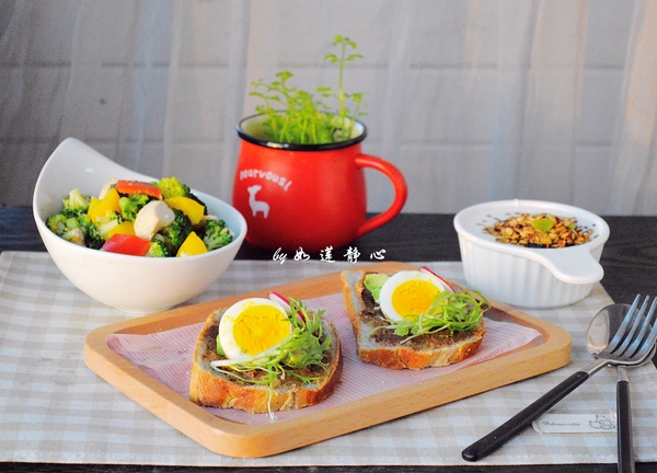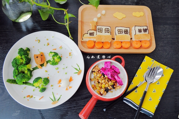 1,面包+西蘭花+鵪鶉蛋+水果堅(jiān)果麥片。小朋友起得早,一起玩美食,剝壞的鵪鶉蛋“吃掉吧”,自己畫完小火車剩下的巧克力醬“抹面包吃掉吧",等到做完說(shuō):”媽媽,我吃飽了“。