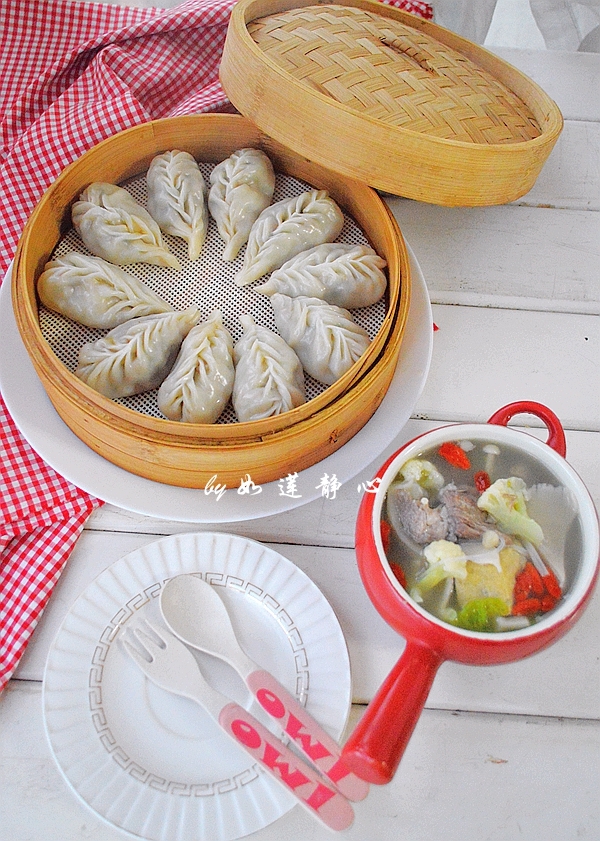 5,花菇胡蘿卜薺菜蒸餃+蝦米高湯煮雜蔬。餃子平時(shí)多包一些存在冰箱,晚上熬了一鍋骨頭湯,加上泡好的蝦米煮了平菇、金針菇、花菜、白菜。