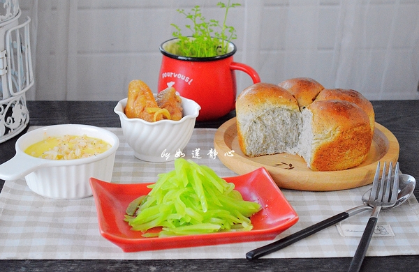 6,黑芝麻全麥餐包+拌萵筍+蝦皮燉蛋+蒸雞翅。晚上腌的雞翅準(zhǔn)備早餐烤,結(jié)果省事與燉蛋一起蒸,味道也不錯(cuò)哦!