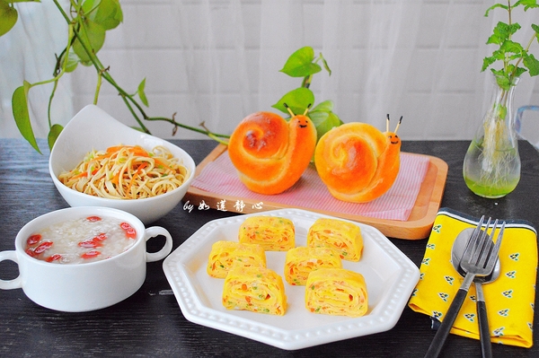 3,胡蘿卜厚蛋燒+蝸牛面包+拌厚百葉+酒釀丸子。不知從哪一天起,我們家也有了一個(gè)不愛吃胡蘿卜的小朋友,慢慢觀察下來(lái),她對(duì)胡蘿卜并不完全排斥,比如剁碎后放在雞蛋里做成厚蛋燒,一口一個(gè)就吃得很香。