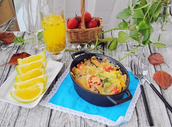 2,芝士焗飯(香菇、彩椒、小西紅柿)+百香果+鮮橙。時(shí)間匆忙的早上,焗飯也是個(gè)不錯(cuò)的選擇,第一天剩下的米飯加熱,香菇彩椒調(diào)味炒勻,拌上米飯,鋪上小西紅柿和芝士,交給烤箱后去催娃起床出來(lái)就能吃了!