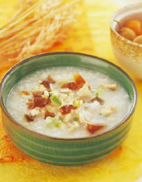 大米、豬瘦肉各100克,榨菜50克;高湯、姜末、蔥末、鹽、味精、水淀粉、植物油各適量。
