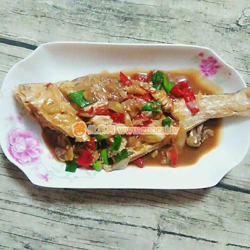 3.魚煎好后!將魚推至一邊!鍋里放入生姜大蒜頭!花椒粒,剁椒爆香。將魚撥下!放入料酒!醬油。少許胡椒粉。加入一小碗溫水大火煮至收汁時放入白糖大蔥不用放鹽了。