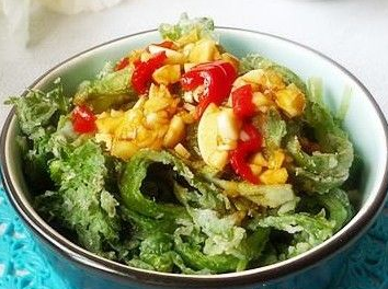 說明:這一步很關(guān)鍵,有不少朋友做出的蒸茼蒿發(fā)粘,就是因為沒有晾干水分。但是,也不能晾的過干,否則面粉無法沾在葉面上。一般來說,以葉面上看不到明顯的水跡,剛好能沾上一層溥溥的面粉為宜。這個尺度是需要反復(fù)實踐的,多次幾次就掌握了。