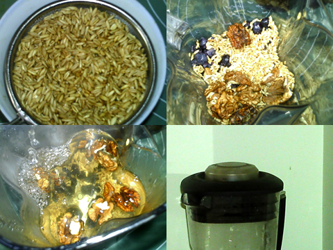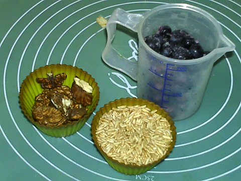 雜糧堅果與水果的組合。葡萄是冷凍的葡萄,從秋到冬,也凍了好長時間,一點(diǎn)點(diǎn)解決掉。核桃去殼,沒炒或烤,雖然那樣會更香。三兩顆核桃,懶得費(fèi)事。燕麥的好處盡人皆知。燕麥米煮飯不太受歡迎,變成燕麥糊,則無需費(fèi)牙勁。結(jié)果看起來還不錯,葡萄的酸甜,燕麥的稠滑,核桃?被埋沒了。。。