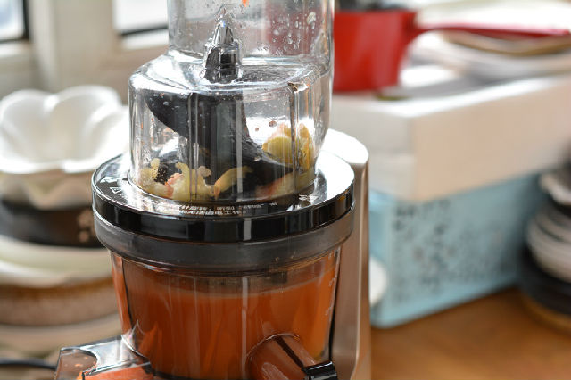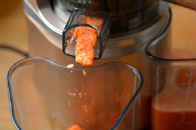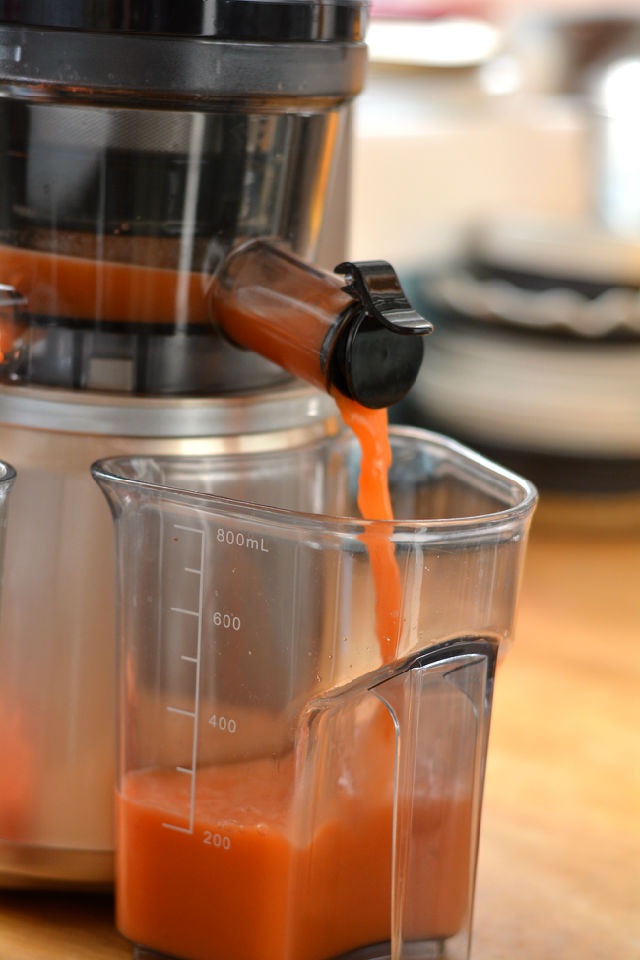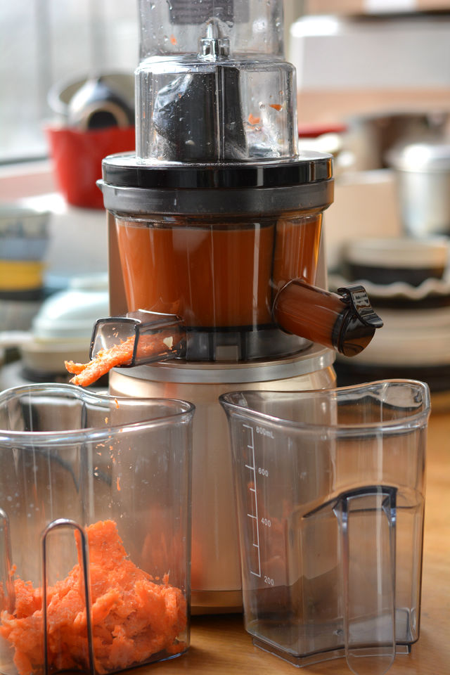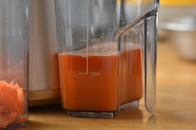 6. 將出汁口的蓋子打開,蘋果胡蘿卜汁噴涌而出;