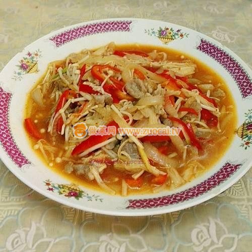 7.加入金針菇略炒,加入炒好的洋蔥紅椒絲