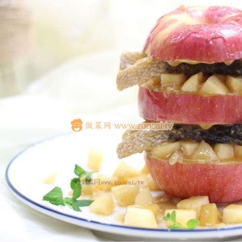 10.取另一個切好的蘋果擺盤,一塊蘋果上先放入剩下的蘋果丁,再放入兩塊魚,再放入一塊蘋果,以此類推,再用薄荷葉點綴即可