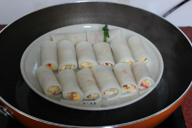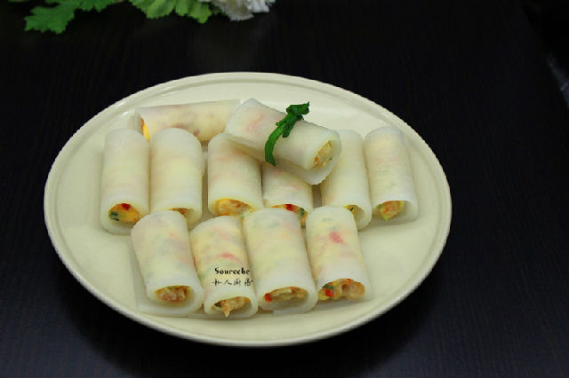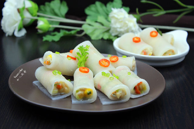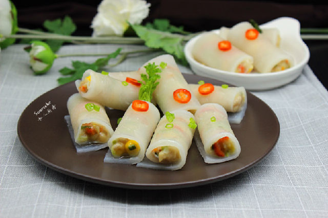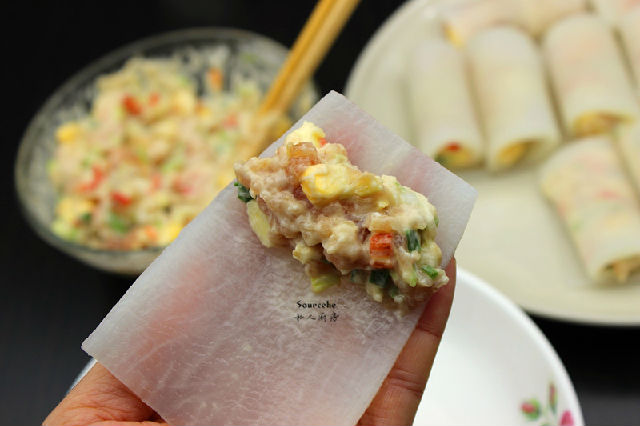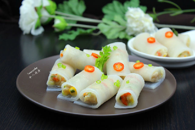 5.晶瑩剔透的蘿卜片放入調(diào)好的餡料,卷起來(lái);