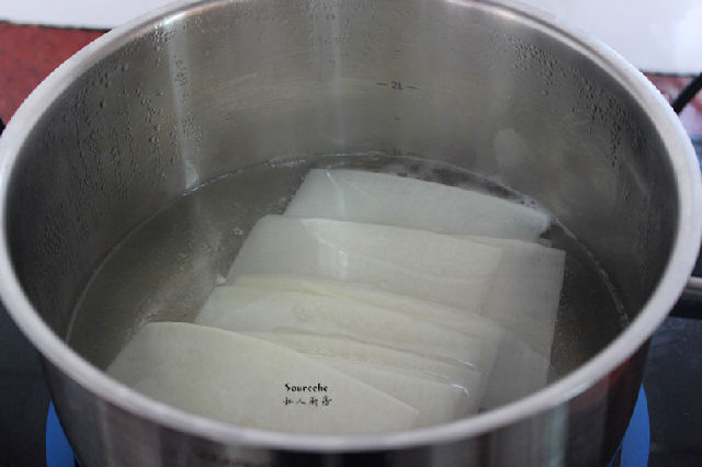 4.白蘿卜去二頭,洗凈去皮,切薄片,放入清水過(guò)鍋一下,過(guò)冷水瀝干放涼;