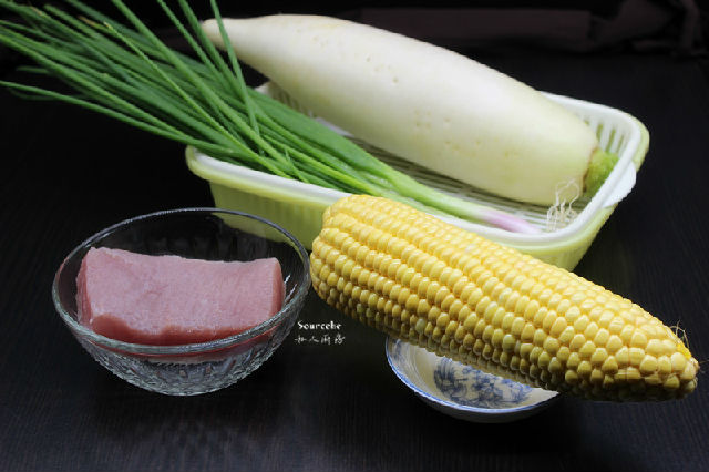 1.主食材:白蘿卜800克、玉米100克、豬瘦肉200克、香蔥50克