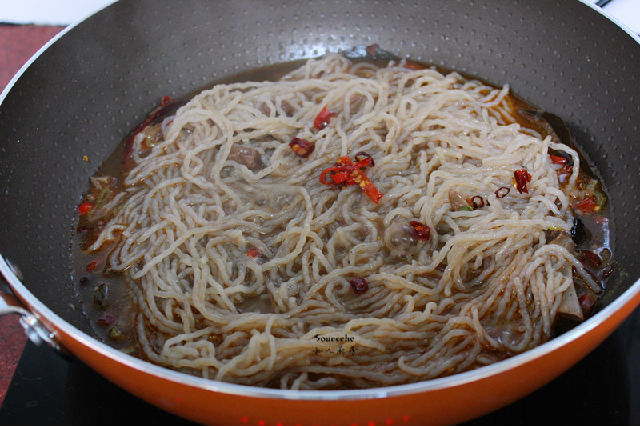 2.清水煮沸,放入紅薯粉,煮軟;PS:可以用熱水泡軟,時間長些