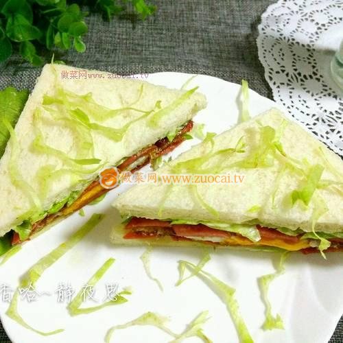 15.最后蓋上兩片生菜,然后把土司蓋上去,抹了沙拉醬的那一面朝下