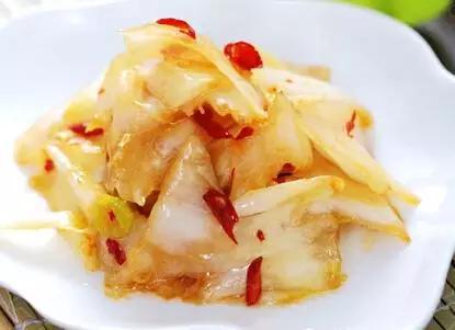 白菜幫200g、油適量、鹽適量、干辣椒2粒、米醋適量、生抽適量、花椒適量、雞精適量、姜適量。