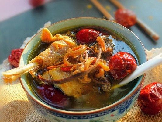 材料:土雞、茶樹菇、紅棗、枸杞、鹽、姜、料酒、魷魚干、瘦肉