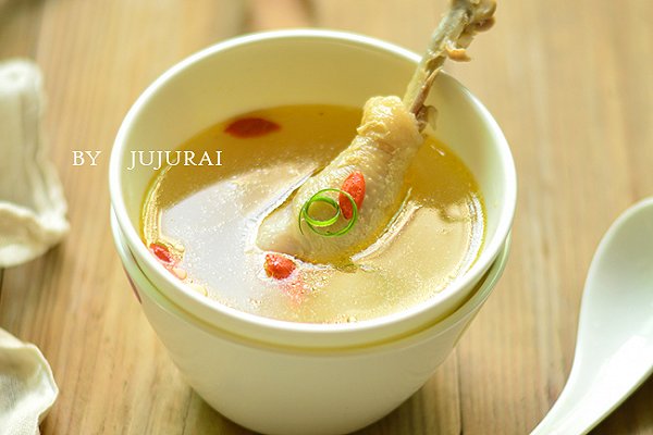 燉湯的雞最好選2斤以內(nèi)的土雞。這樣的雞肉嫩,湯好喝。茶樹菇,紅棗,魷魚,都是很鮮美的食材。加進去燉,這個湯只需放鹽。無需再加其它調(diào)鮮的調(diào)料。紅棗枸杞不用放太多。太多湯太甜。