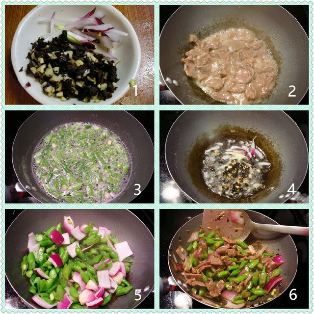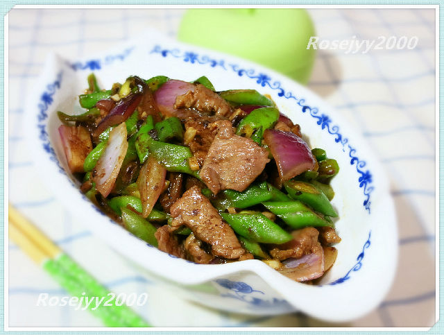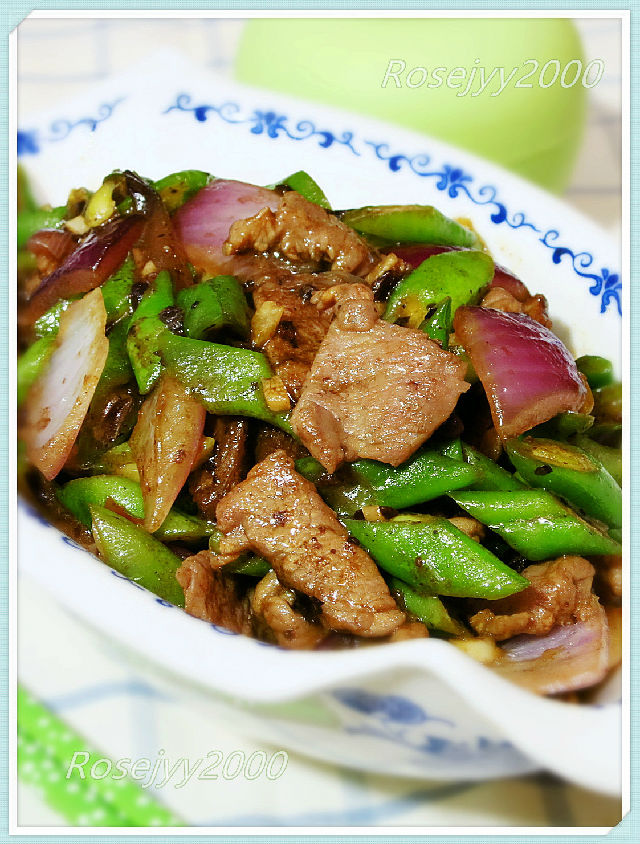 食材:牛肉約150克,四季豆約400克,洋蔥1/4個,豆豉1湯匙,蒜頭2瓣,辣椒碎1/2湯匙。
