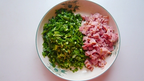 1準(zhǔn)備好原料,韭菜洗凈切小段,培根切成小丁。